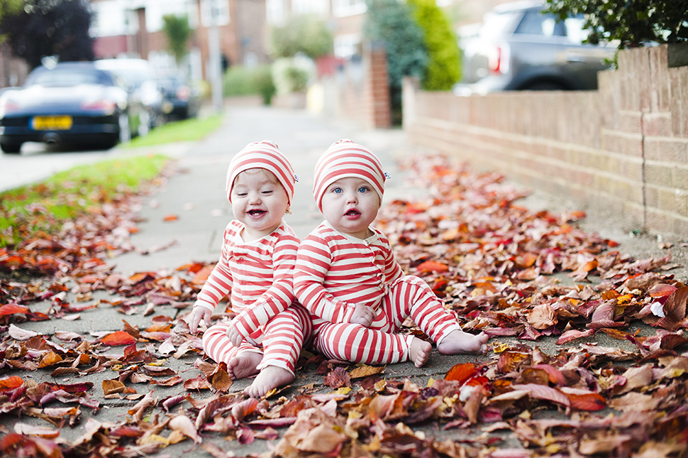 With the weather being so nice of recent I thought that I would give myself a little after-work treat and when the twins turned up at the station looking so cute in their Panda and the Sparrow pyjamas and matching hats, couldn’t resist pulling them out of their pram for a quick play with mama in the leaves.